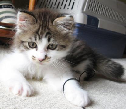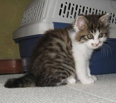 元気で食欲旺盛な子ネコです。保護した後で首に傷跡を見つけましたが毎日の消毒で直ってきました。首まわりの毛も増えてきてモフモフ感がアップすると思います。動物病院でノミダニと回虫対策のレボリューションをつけてもらい、その3日後に3種混合ワクチン(1回目)を接種。初日からトイレにウンチもオシッコもきちんとできるいいコです。