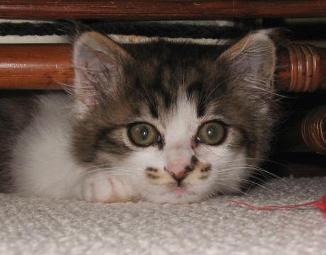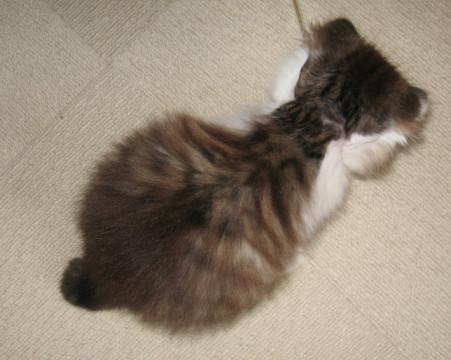 フワフワ長毛タイプのキジシロの男の子。尻尾は5~6cmくらいの長さだと思います。保護直後は必死になって隙間にもぐり込んだり、人が手を伸ばすと体を硬くし「シャー!」と唸ったり、野生児ぶりを見せていました。最近は触っても唸らずオモチャで遊ぶようになり、オモチャを見せると自分でケージから出てきて追いかけるようになりました。活発に遊ぶ子ネコらしさを引き出しもっと人に慣れるように毎日遊び相手になっています。