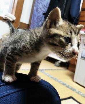 まだあどけない顔立ちのよちよち歩きのキジ白、はるくんです。