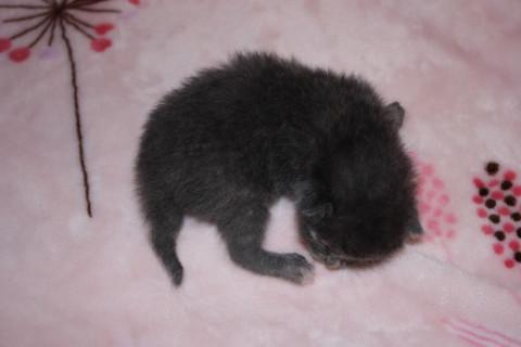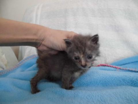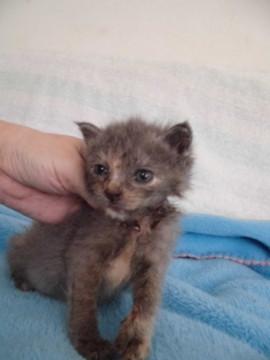 かわいいパステルさびのかれんちゃんです。一見グレーですが、サビ猫ちゃんです。コロコロした体型とサビ特有のビックリ顔がとってもかわいらしいです。まだ小さいので性格ははっきりわかりませんが、ミルクから育てているので大変人懐こくなりますし、撫でてやるともうゴロゴロ言っています。乳飲み子にしては大柄なので、大きい子に育つかもしれません。