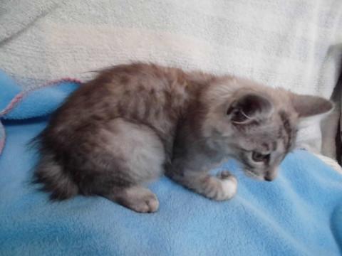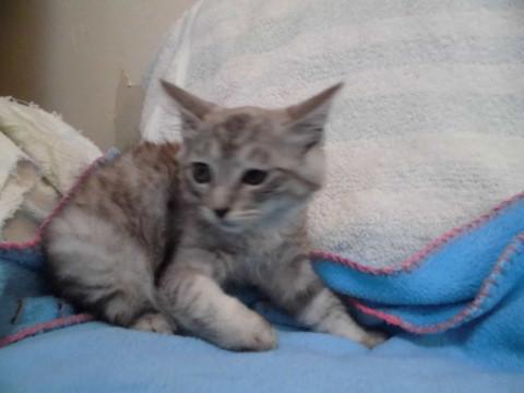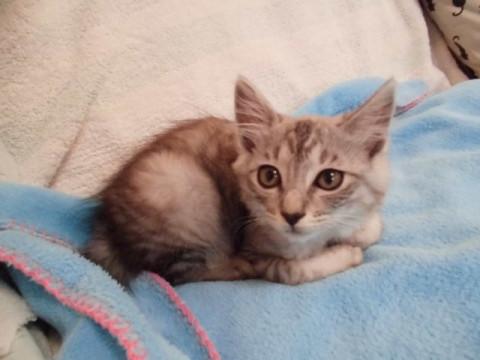 きれいなシルバーのさばとら、あめでぃお君です。しっぽがうさぎのようなボブテイル、ころころの体型も可愛らしいです。性格はフレンドリーで大変人懐こいです。