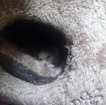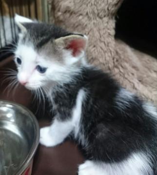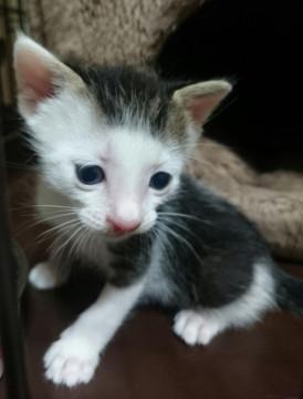 野良ちゃんが産んだ子です。黒白と言っても良いくらいの色ですが、わずかに縞があるのでキジ白としています。