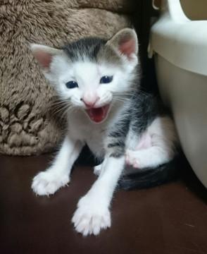 目が開いた時から人を見て暮らしているので、人慣れしています。一人っ子ですが、いとこ関係の子猫たちと毎日遊んでいるので、社会性も育ってきています。