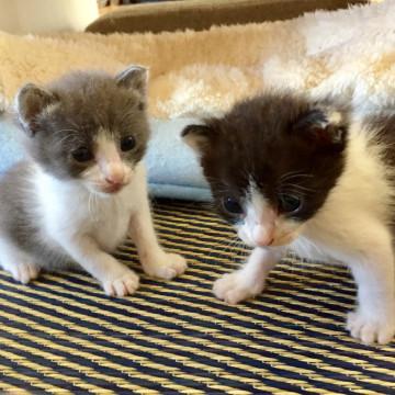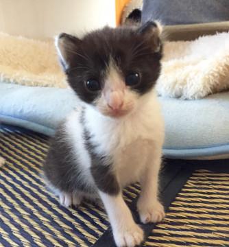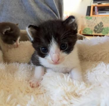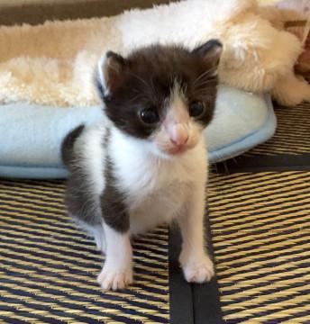 生後二週間くらいの白黒ハチワレの男の子です。哺乳瓶から上手にミルクを飲みます。