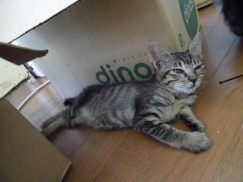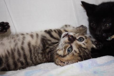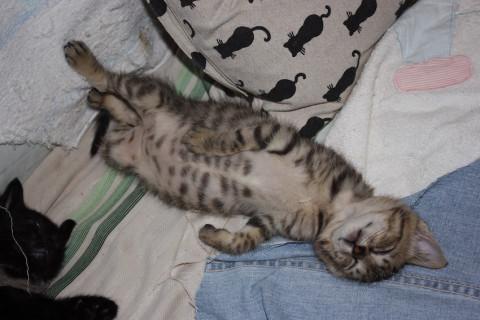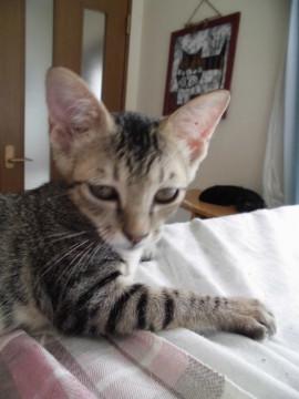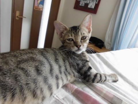 かわいいキジトラそよりちゃんです。ちょっと困ったような、眠そうなお顔がキュートです。ミルクから育てているので大変人懐こく甘えん坊、おっとりさんです。他の猫ちゃんにもフレンドリーです。