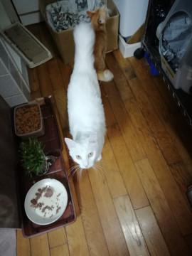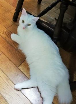 白長毛。 尻尾はかぎ。 少し怖がりで慣れるのにすこし時間がかかりましたが、他の猫とも上手に付き合えています。