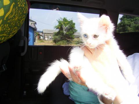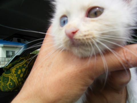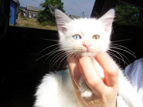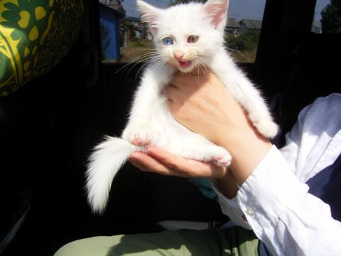 雨でぬかっており、顔や手足が泥で汚れていた為、洗っても少し茶色が落ちなかったが、時間が経てば真白な仔だと思われる。