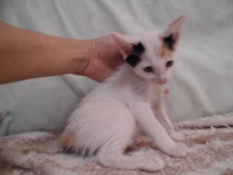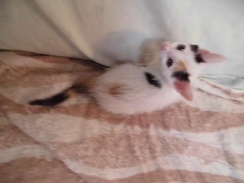 可愛い三毛猫、めありちゃんです。白い部分が多い白三毛です。少しビビリさんですが大変人懐こくお膝が大好き、他の猫ちゃんとも仲良くなれます。