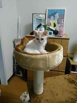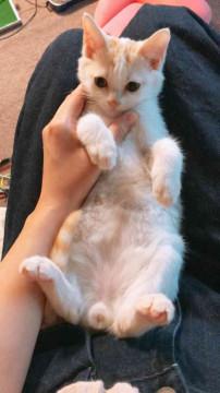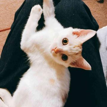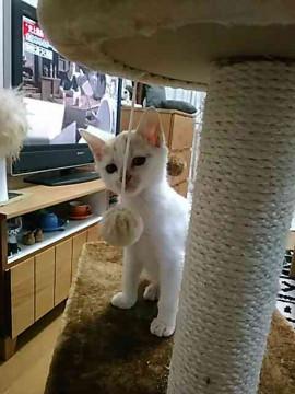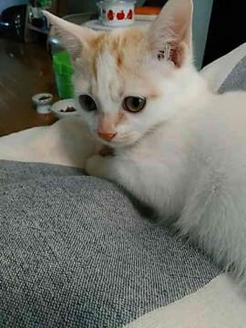 白地に薄い茶色の模様がところどころあります。人懐っこくおもちゃでよく遊びます。