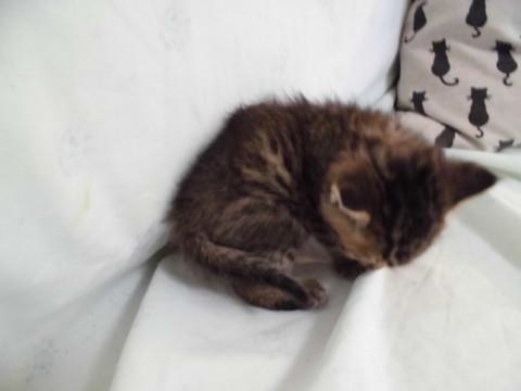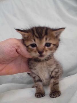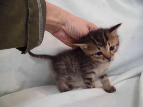 かわいいキジトラ、たつる君です。くまちゃんのぬいぐるみのようにころころです。まだ小さいので性格ははっきりわかりませんが、ミルクから育てているので大変人懐こくなります。