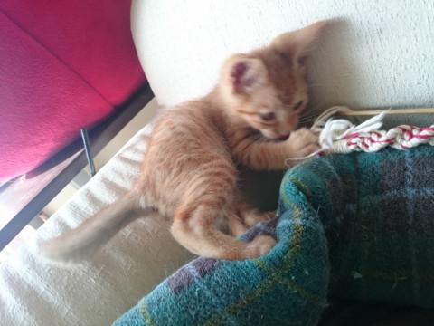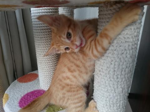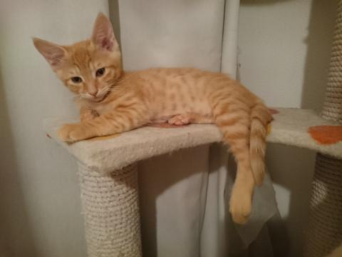 茶トラくんです。しっぽは長いです。甘えっ子で、かわいい子猫です。