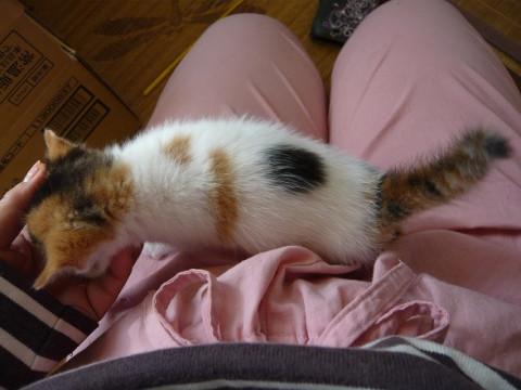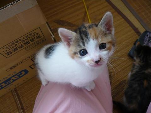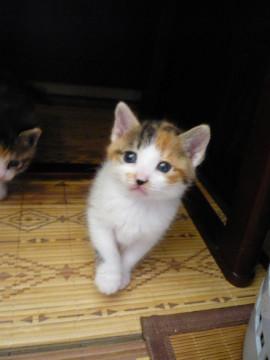 背中は白の多い三毛で背中の真ん中に黒丸模様があります