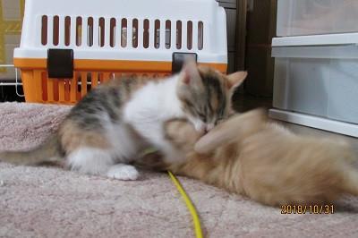 赤ちゃん猫5匹のうち、三毛猫と茶トラを一緒に