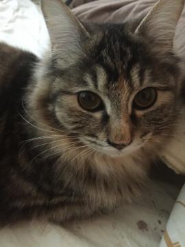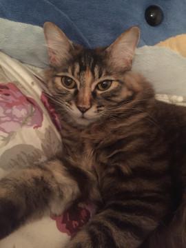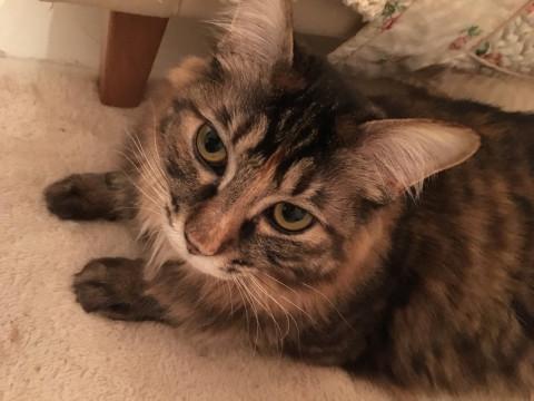 サバトラとサビの合いの子なのか、不思議な毛色です。ポワポワモフモフしていてかわゆいです。