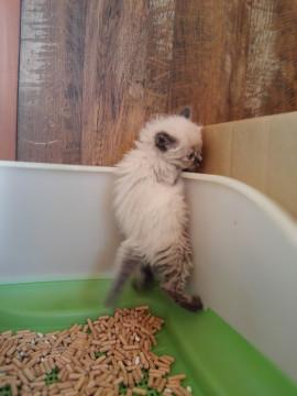 シャムカラーと淡いブルーの瞳をもつキレイな男の子です。