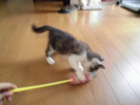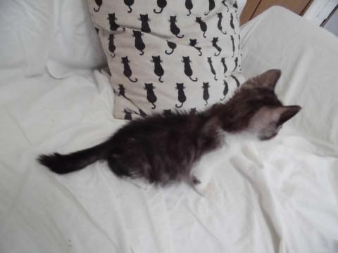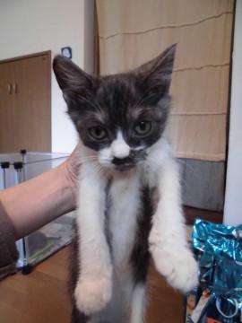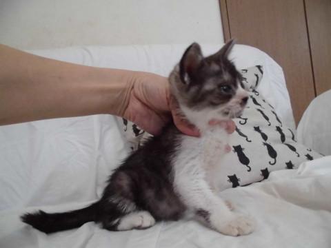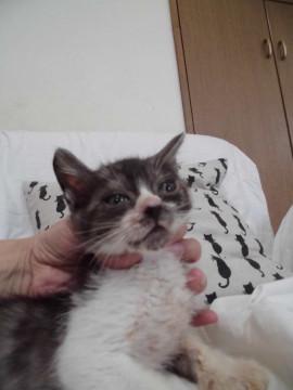 可愛い子猫ありあきら君です。一見黒白ですが、縞模様もあり、下毛は白っぽいのでグレーにも見えなんとも形容しがたい毛色(柄)です。頭が大きくちょっとペチャ顏なのでペルシャなどのよう猫が混ざっていると思います。口の周りと鼻の下に模様があるのでちょっと泥棒顔なところと、ガニ股なのに飛び跳ねるように走るのでワニワニ・ぴょこぴょこと走る姿がとってもキュートです。性格は大変人懐こく、はた迷惑なくらいぐいぐい甘えてきます。他の猫ちゃんにもとってもフレンドリーです。