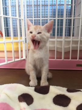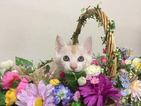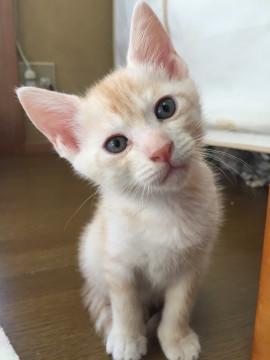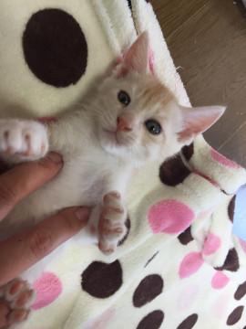 4匹兄弟の中で一番体が大きく、活発な男の子です。食欲旺盛、快眠、快便です。目の色がブルーと黄色のミックスでとてもきれいです。(今後変わるかもしれません)。