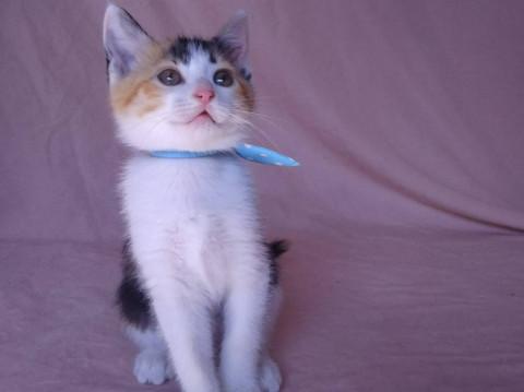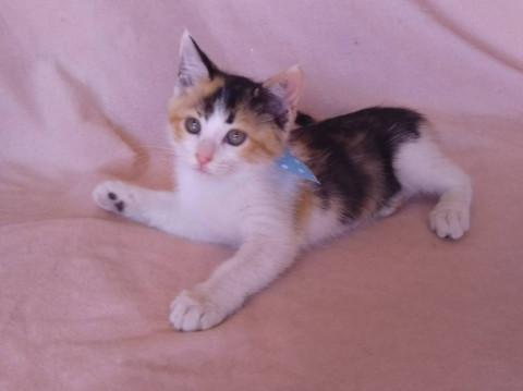 丸顔の可愛い三毛猫です。かわいい四姉妹です。子猫らしく元気に日々を過ごしています。。