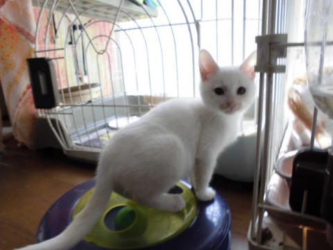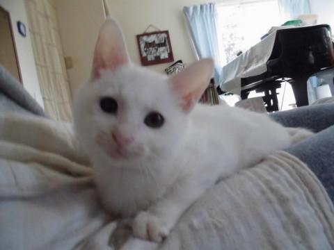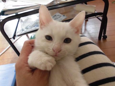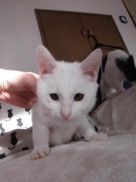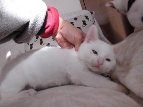 可愛い白猫いおにあんちゃんです。真っ白で頭が大きいので、まるで雪見だいふくのようです。ミルクから育てているので大変人懐こく、肩に乗ったりお膝に来たりぴったりぺったりくっついてきます。食欲旺盛でとても元気です。