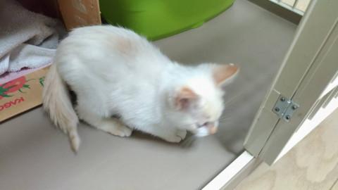 目が少し斜視です。視力自体は問題なく見た目だけなので、ハンデと言うより個性だと思います。ブルーアイでとっても可愛い男の子です。とても甘えん坊でゴロゴロが止まりません。子猫らしく元気に遊んでます。