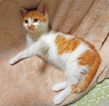 【毛色】 茶白。横腹にハートマークの模様がある。しっぽは長くてまっすぐ