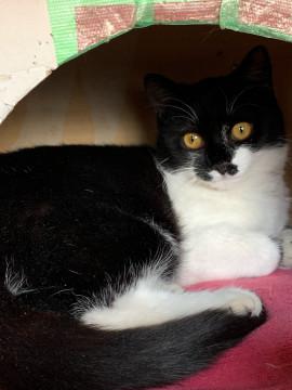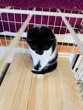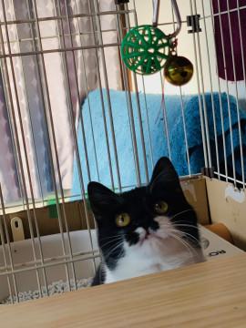 性格は、穏やかな甘々さんです。白黒柄に、お目綺麗な金色、尾尻も綺麗に長く、とっても美猫ちゃんです。