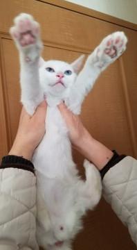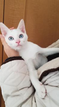 白地に頭にグレー柄ありの尾尻長く綺麗です。馴れ馴れ、他の猫ちゃん共仲良しです。