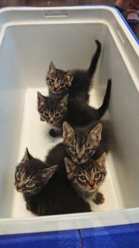 5匹いますがどの子も愛らしく、コロコロしています。よく食べよく遊びます。色はサバトラをベースに黒っぽいです。
