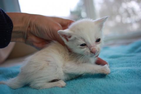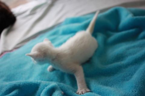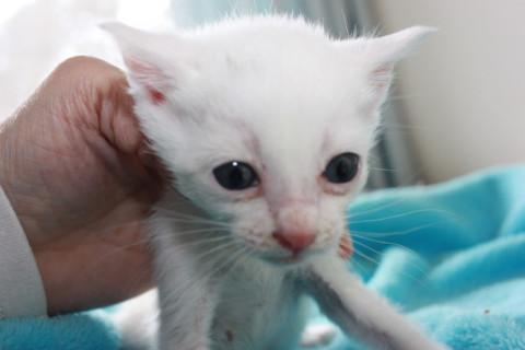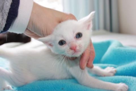 可愛い白猫えれすちゃんです。現在お目めはキトンブルーなので青く見えますが、ブルーアイにはならないのではないかと思います。まだ小さいので性格はわかりませんが、ミルクから育てるので人懐こくなります。活発で食欲旺盛です。