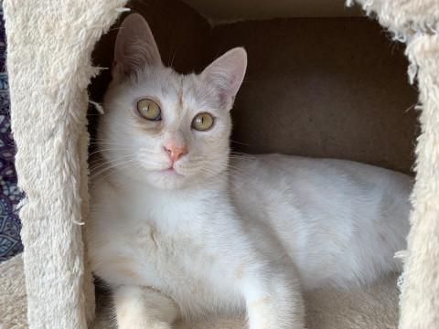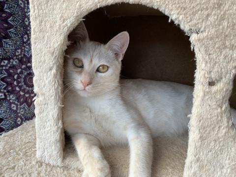 少し怖がりで控えめな性格です。兄弟で遊ぶ時も、なかなかおもちゃに飛びつけず、後ろでもじもじするタイプです。言いたいことがあると、鳴いてお知らせします。