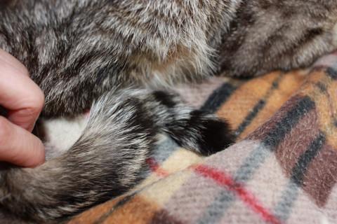 可愛いキジ白、ぶらいあん君です。ちょっと困り顔の丸顔、手袋靴下がとってもキュート。最初は人見知りしますが、すぐにゴロゴロ言ってくれるようになりました。結構しっかりした鍵尻尾です。