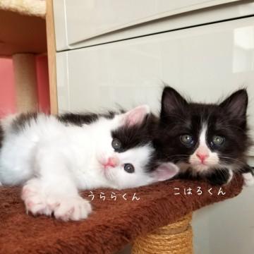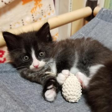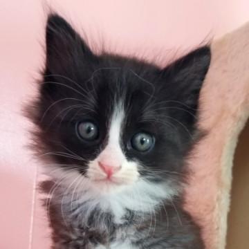 生後1ヵ月半ほどの、かわいい白黒ハチワレの男の子です。