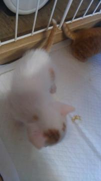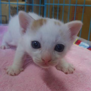 白に頭とシッポに茶シマが入っている面白い柄の子です。