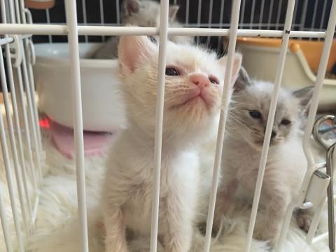 白地に薄い茶色のシールポイントが耳と尻尾など、体の先端部に出て来ており、だんだんと濃くなる可能性あり。