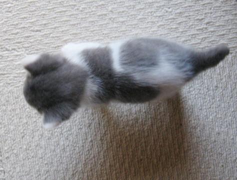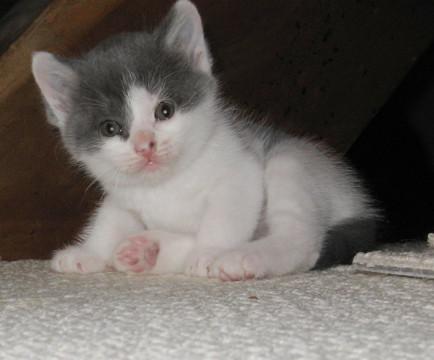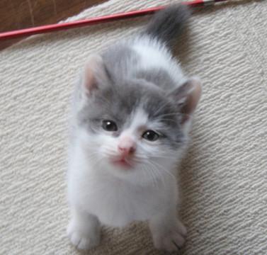 毎日のように兄弟同士でじゃれたり追いかけっこしたり、オモチャで遊んだり元気です。性格がおっとりしているのか餌を食べるときは、兄弟と先を争うより最後にゆっくり食べていることが多いようです。毛色は白とグレーのまだら模様で、顔の配色は末広がりで縁起のいいハチワレです。尻尾は途中で巻貝のように内側にカールしています。ピンク色の鼻に黒ごまがチャームポイント。