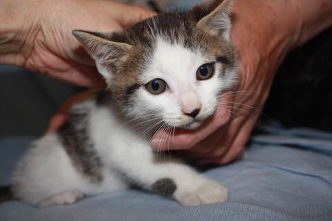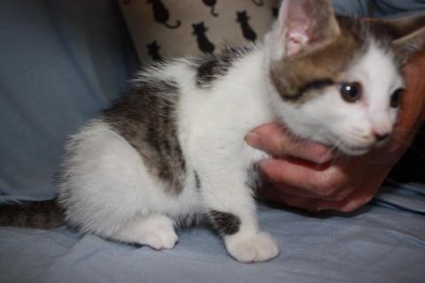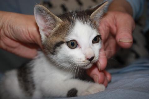 可愛いキジ白、はちくんです。センター分けのようなお顔の模様と、体の丸い模様が可愛らしいです。少しビビリですが十分人馴れしており、(今の所)おっとりさんです。