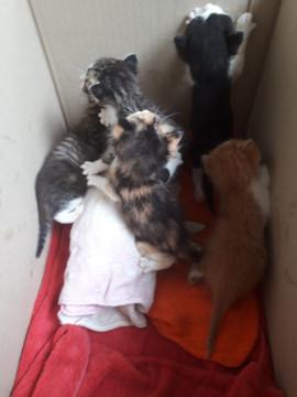 近所の小屋に生後二週間ほどの子猫5匹が雷雨の後にいました。親が来るかもしれないと一晩そのままにしましたが、親は現れなかったようです。