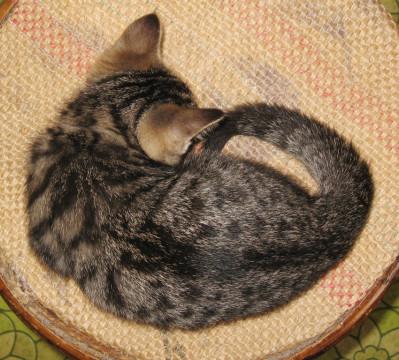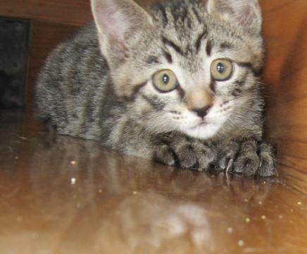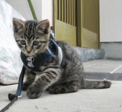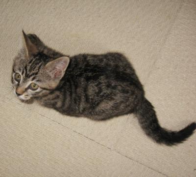 体はキジトラ模様ですが黒が濃いので「黒トラ」というのでしょうか。尻尾は長くまっすぐです。生まれたときから人に接していたので物おじしない性格で人に抱っこされるのも大丈夫。オモチャで遊んでもらうのが大好きで飽きずにじゃれてきます。ただ、母ネコとしか接していないせいか我が家にいる体の大きな雄ネコには毛を逆立てて「シャー!」とうなっています。リードを付けて庭先に出すと木に登ったり駆け回ったりおてんばぶりを発揮。