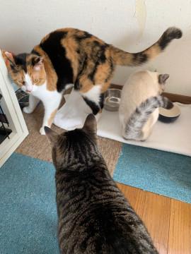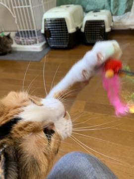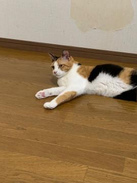 とっても人馴れしている三毛猫で、スリスリと甘えてきます。甘えん坊ですが、1匹で居る事を好むときもあります。気が小さく、一緒に暮らす成猫とは、苦手。自分より小さい子には、優しくする優しい子になります。面倒見がいい子です。