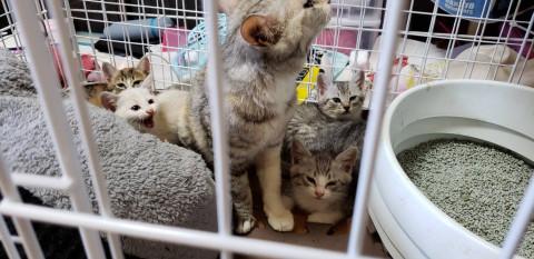 幼い仔猫ちゃん四匹と三毛猫母さん 全頭保護が成功し、