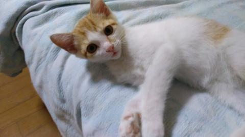 白が多めの茶白で、お腹を出して寝るのが得意。