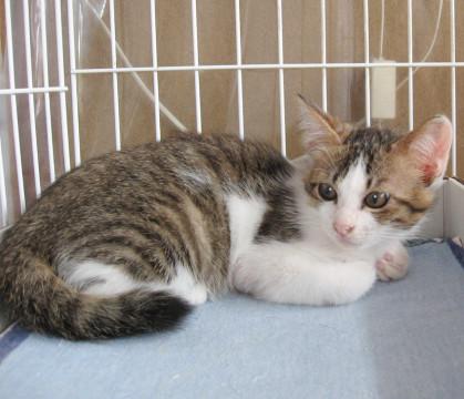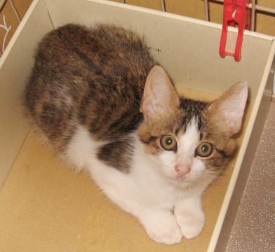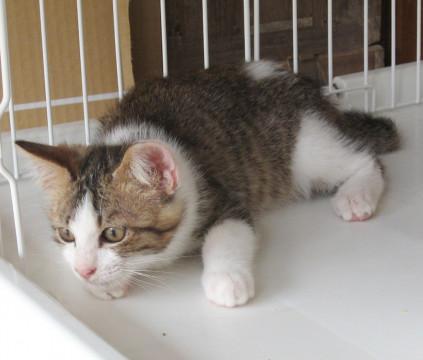 毛色は白とキジトラの斑模様になっていて顔の配色は末広がりで縁起がいいと言われている八ワレ。長い尻尾は先のほうが「くの字」にちょっと曲がっています。ボール遊びが大好きな健康優良児です。今は人との接触に慣れさせている段階で、最初は触ろうとすると鼻にしわを寄せてうなりましたが、次第にお腹や喉をなぜてもらうのがうれしいようです。自分から鼻をくっつけて挨拶する時も。我が家の大人のネコに興味津々ですが相手にされてない様子。トイレは最初からきちんと使えるお行儀のいいコです。