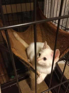 体は白で、おめめはブルーアイの女の子です。耳と尻尾に茶色のポイントカラーが入っています。