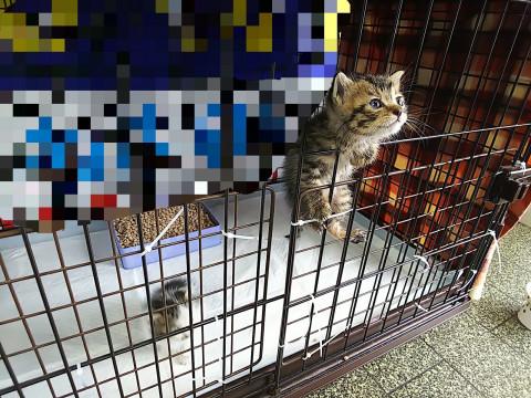 保護した当初生後1ヶ月くらいかな?と思いましたがとても体重が軽く成長曲線に乗っていない子であろうという感じでしたが、現在はミルクものみご飯もよく食べ順調に体重が増えています。6枚目の写真にあるようにケージを通り抜けられるほど小さかったのですが食事やトイレなどの状況からして1ヶ月は越えているだろうというのが獣医さんの見解でした。