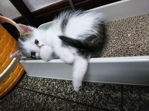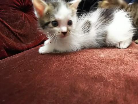 体は白ベースに黒ぶちですが顏の一部にうっすら茶色がかったところがありますので一応ミケで募集をしましたが写真で判断してください。