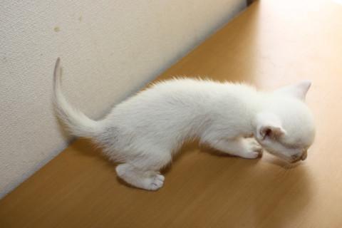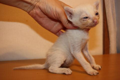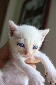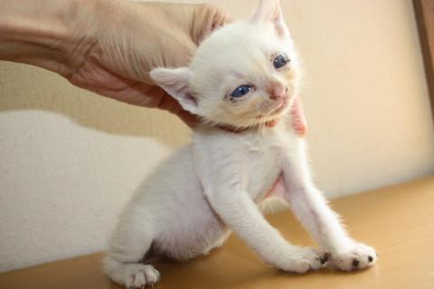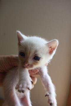 可愛い白猫、かまんべーるちゃんです。綺麗なブルーアイです。尻尾やお顔の地色が違うので、これから柄が出てくるのではないかと思います。(シャム風かラグドール風???)性格はまだ小さいのではっきりわかりませんが、ミルクから育てるので大変人懐こくなります。