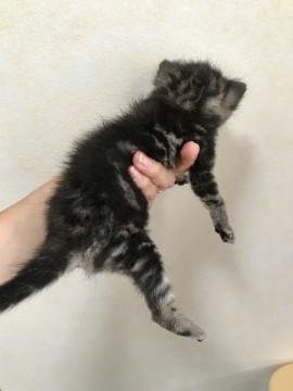 脇腹のところにアメショのような渦が少し入っています。とても可愛い柄です。M字マークも可愛いです。尾はまっすぐです。