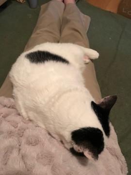 性格はおとなしく、一人でも自分の居場所を見つけて、じっと寝ています。しかし、オモチャで遊んだ事がないのか、オモチャは夢中になって遊びます。特にネズミのオモチャや、ストローでも遊びます。保護した当時から段々慣れてくれて、夜添い寝をしてくれることもあります。機嫌がいいと足の上にも乗ってくれます。鼻の上を撫でると気持ちよいらしく、スリスリしてきます。お姫様気質なので、構い過ぎると猫パンチが飛びます。