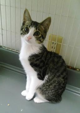 綺麗なキジ白柄、大きくてまん丸の目、しっぽは長いです。