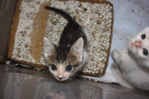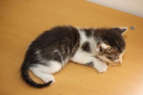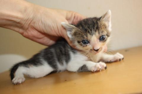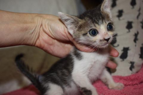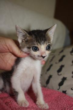 可愛いキジ白、ちぇだー君です。兄弟の中では一番小柄でしたご飯をいっぱい食べてすくすく成長しています。こぼれ落ちそうな大きな大きなお目目がチャームポイントです。性格はまだ小さいのではっきりわかりませんが、ミルクから育てていたので大変人懐こくなります。